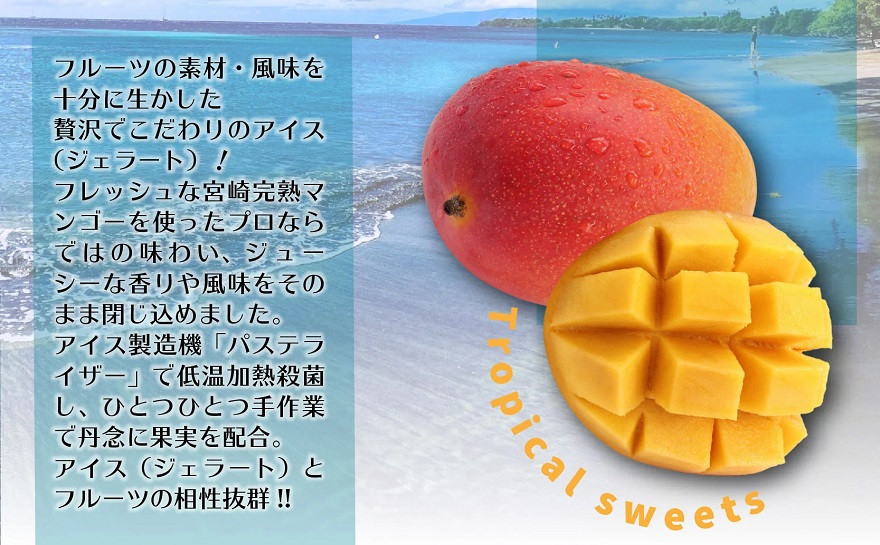 宮崎市産完熟マンゴーを贅沢に使用!フルーツの素材・風味を十分に生かした贅沢でこだわりのアイス(ジェラート)! フレッシュな宮崎完熟マンゴーを使ったプロならではの味わい、ジューシーな香りや風味をそのまま閉じ込めました。アイス製造機「パステライザー」で低温加熱殺菌し、ひとつひとつ手作業で丹念に果実を配合。アイス(ジェラート)とフルーツの相性抜群!!