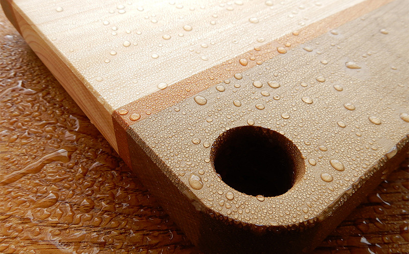 原材料は主に国内産の木材を使用しており、安全な浸透性塗料(セラミック)を塗布することで高い抗菌力を発揮し、簡単なお手入れでもカビの発生を抑えることが可能となりました。木製まな板は、気温、湿度の変化によって反ったりヒビが発生するのが当たり前ですが、それらを抑えるために異なる種類の木材を接(は)ぎ合わせ、見た目にも美しい色合いとなるようバランスよく仕上げました。
