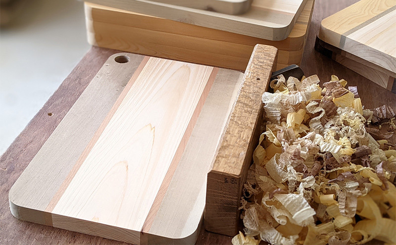 また、異なる樹種の木材の組み合わせにより色合いのコントラストが生まれ、見た目にも楽しいまな板に仕上がりました。キッチンに立つ時間がより楽しいものになれば、と思いを込めて、ひとつひとつ丁寧に制作しています。