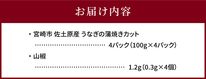 | 容量 | ・和匠うなぎのカット蒲焼 100g×4パック ・山椒 1.2g(0.3g×4個) (原産地:宮崎県宮崎市) |