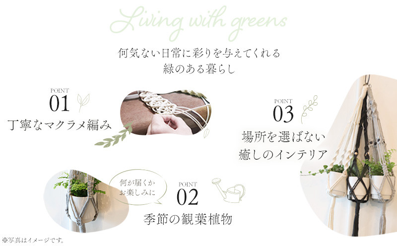 | 容量 | ・マクラメハンギングプランター(グレー) ・季節の観葉植物 ・3号鉢カバー (製造地:宮崎県宮崎市) |