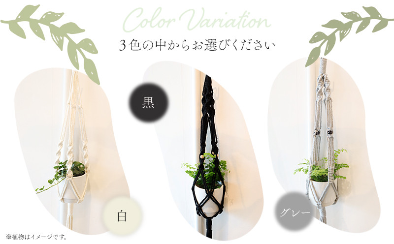 3色の中からお好きな色をお選びいただき、一つ一つ手編みいたします。そのマクラメハンギングプランターに季節の植物をお入れしてお届けいたします。