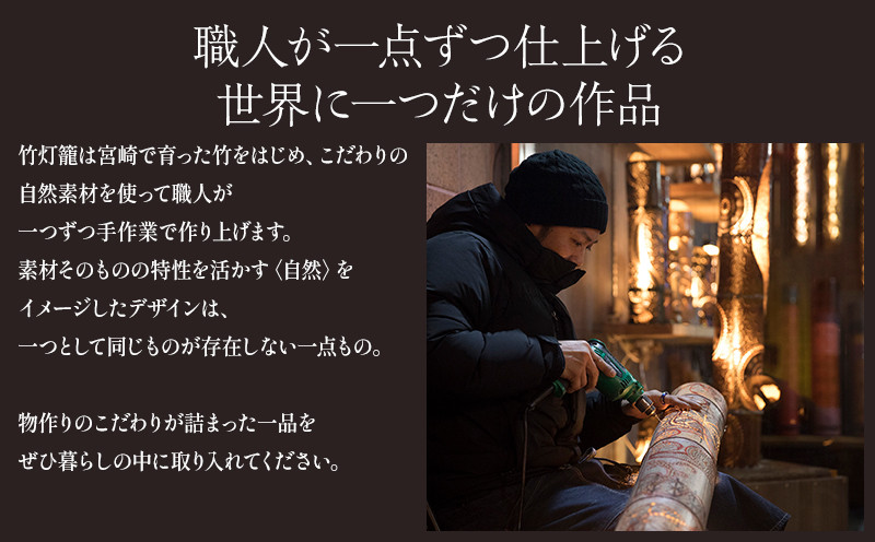 | 容量 | ・竹灯籠・麻柄 45cmサイズ(麻紐:緑色) 高さ約45cm×幅約15cm ※台座含む ・LED電球8.1W(電球色) ・台座 (加工地:宮崎県宮崎市) |