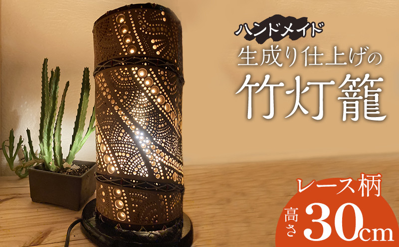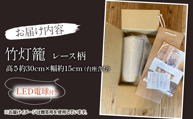 生成り仕上げの 竹灯籠 レース柄 30cm サイズ 台座付き LED電球 ハンドメイド 手作業 一点もの リーハンド 全工程手仕上げ 贈り物 自然素材