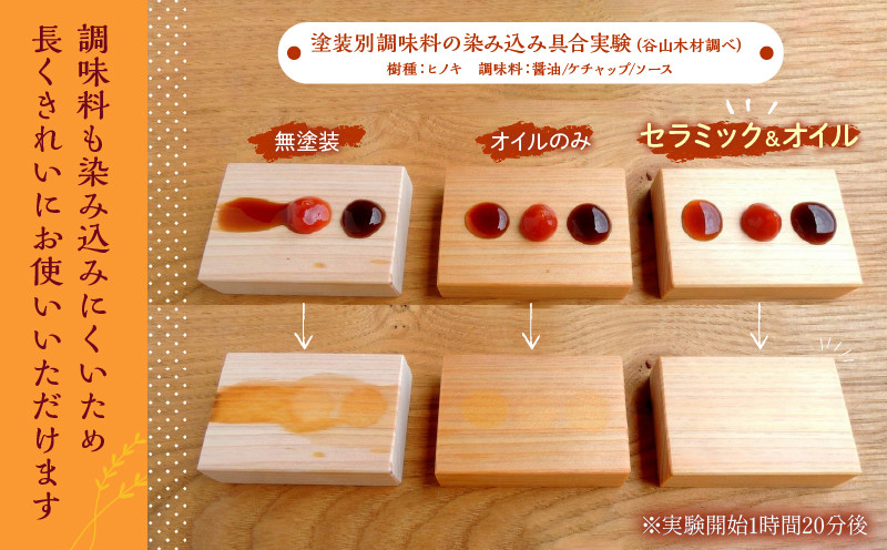 塗膜を形成しないため包丁傷は普通につきますが、熱や衝撃で塗料がはがれることがなく、木の手触りや質感もそのまま生かされています。