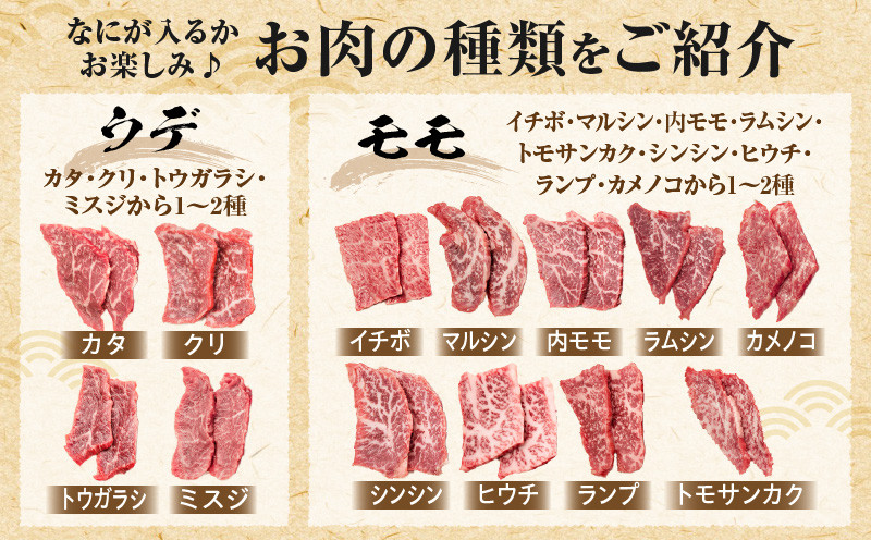 | 容量 | 全24種類中4~8種類お届け ・宮崎牛ウデ焼肉200g カタ、クリ、トウガラシ、ミスジの中から1~2種類 ・宮崎牛モモ焼肉200g イチボ、マルシン、内モモ、ラムシン、トモサンカク、シンシン、ヒウチ、ランプ、カメノコの中から1~2種類 ・宮崎牛バラ焼肉200g カイノミ、カルビ、ササバラ、三角バラ、中落ちカルビの中から1~2種類 ・宮崎牛ロース焼肉200g ロースかぶり、肩ロース、サーロイン、リブ芯、ザブトン、リブロースの中から1~2種類 合計800g(原産地:宮崎県) ※1種類あたり100gもしくは200g ※部位はご指定いただけません。 |