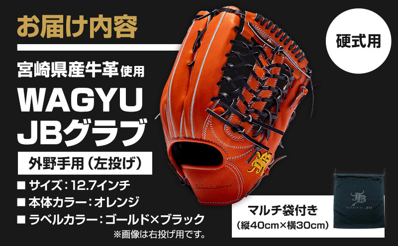 チョイスPayポイントと交換できる品 軽量 型くずれしにくく しなやかに粘る が特徴の宮崎県産牛革使用の硬式用のグラブ 宮崎県産牛革使用 WAGYU JB 硬式用 グラブ 外野手用 JB-009(オレンジ/左投げ用)_M147-066