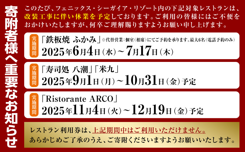 ・寄附お申し込み受付後、フェニックス・シーガイア・リゾートよりレストラン利用券を送付いたします。