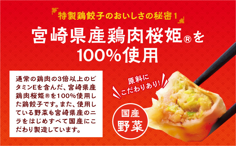 悠瑠里特製鶏餃子は、通常の鶏肉の3倍以上のビタミンEを含んだ、宮崎県産鶏肉桜姫Ⓡを100%使用した鶏餃子です。