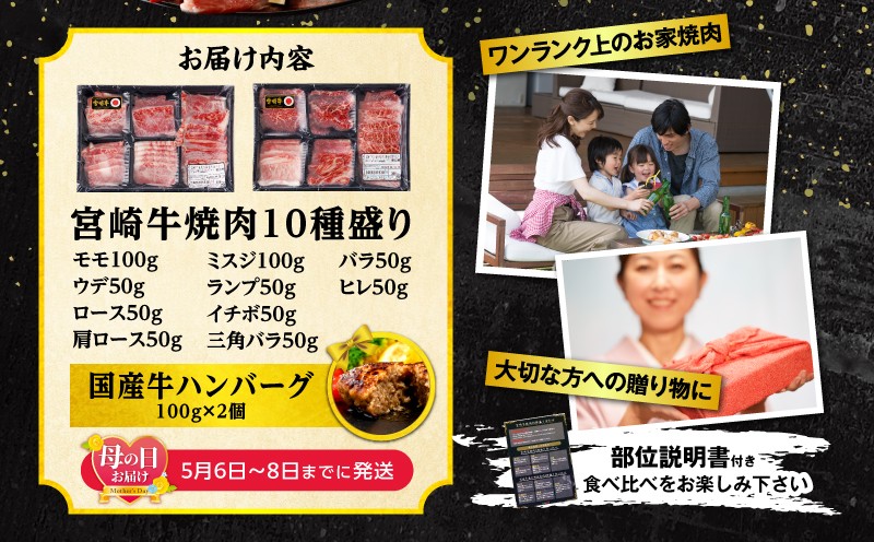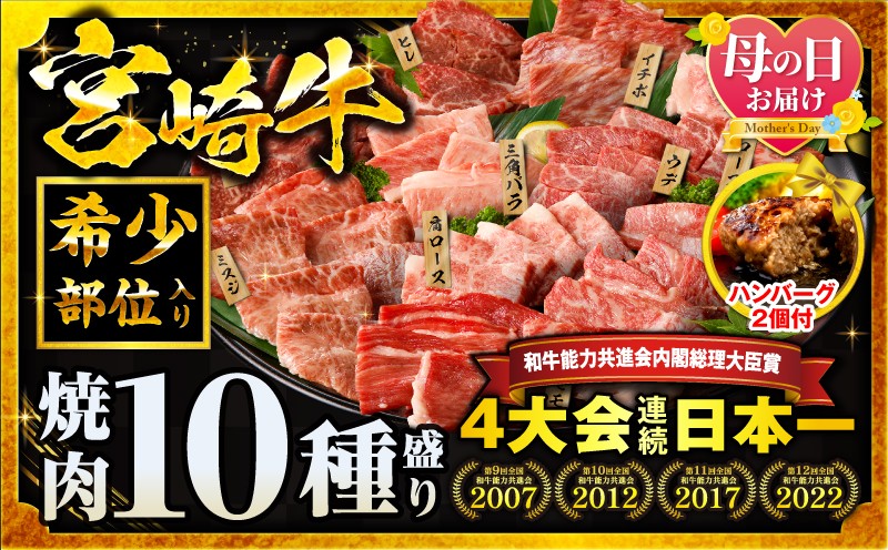 チョイスPayポイントと交換できる品 希少部位を含む、宮崎牛焼肉10種の食べ比べセット! 【母の日までにお届け】畜産農家応援!宮崎牛 焼肉 10種 盛り合わせ・国産牛ハンバーグ100g×2個 宮崎牛 焼肉 焼肉用 肉 お肉 牛 牛肉 ミヤチク 盛り合わせ 食べ比べ セット 焼肉セット 贈り物 ギフト 国産 国産牛 人気 おすすめ モモ もも ウデ ロース 肩ロース バラ ミスジ ランプ イチボ ヒレ ひれ BBQ バーベキュー 焼き肉 焼肉セット 宮崎県産 _M132-067-SKU