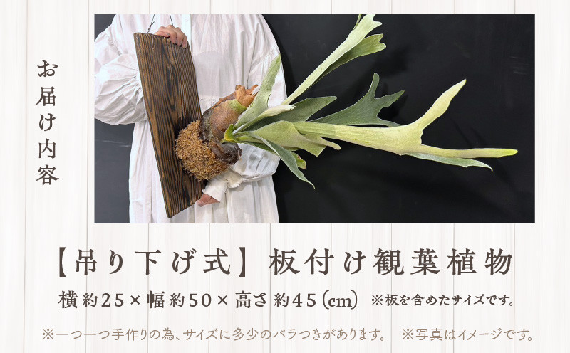 | 容量 | 【吊り下げ式】板付け観葉植物 横約25×幅約50×高さ約45(cm) ※板を含めたサイズです。 |