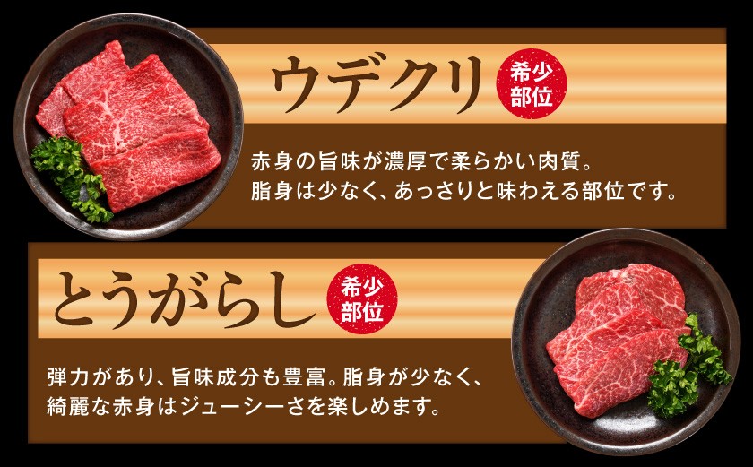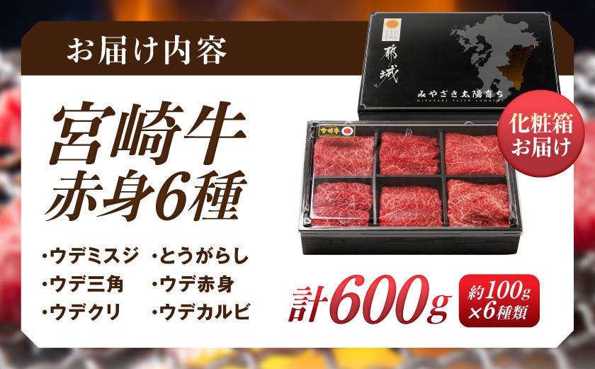 チョイスPayポイントと交換できる品 宮崎牛のウデを6部位にカットしました。味と食感の違いを比ベてみてください♪ 宮崎牛赤身6種600g_16-2601_(都城市) 牛肉 赤身 希少部位 食べ比べ 焼き肉 焼肉 BBQ ウデミスジ ウデ三角 ウデクリ とうがらし ウデ赤身 ウデカルビ 約100g 計600g 6種類セット