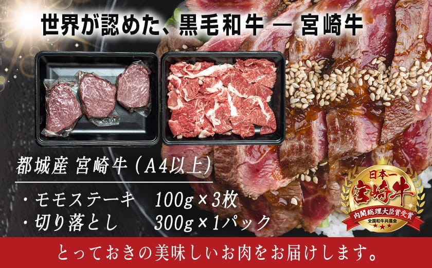 チョイスPayポイントと交換できる品 牛肉の旨味を楽しめるモモステーキと赤身肉の切り落としセットです♪ 宮崎牛モモステーキ・切り落とし600gセット_MJ-2510_(都城市) 都城産 宮崎牛 牛肉セット 牛モモステーキ用 100g×3枚 牛切り落とし 300g×1パック 赤身肉 牛ステーキ肉 牛切落し