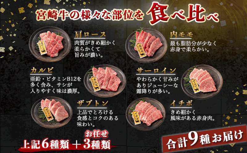 チョイスPayポイントと交換できる品 口の中に広がる肉汁の風味と旨み!都城産宮崎牛焼肉9種食べ比べ! 宮崎牛焼肉食べ比べ9種盛_32-3101_(都城市) 都城産 宮崎牛 A4ランク 焼肉 セット 肩ロース カルビ ザブトン 内モモ サーロイン イチボ 6種類 お任せ にくほんぽ黒たれ 9種 にくほんぽ黒たれ 1本 国産 牛肉