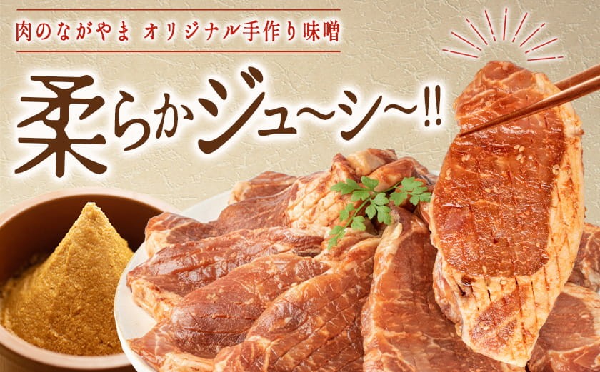 肉のながやまオリジナルの手作り味噌で漬け込んだ豚ロース味噌漬けを3枚ずつ真空パックにしてお届けします。