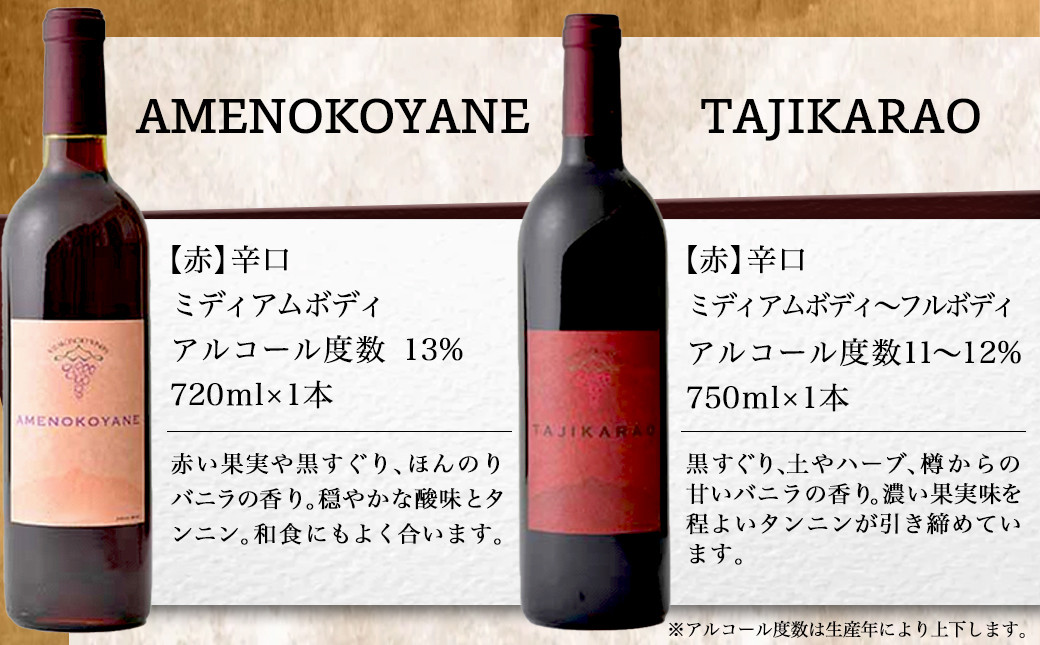 ◆TAJIKARAO:スポーツの神様。樽発酵樽熟成。樽からの甘いバニラの香り、濃い果実味に程よいタンニン。
