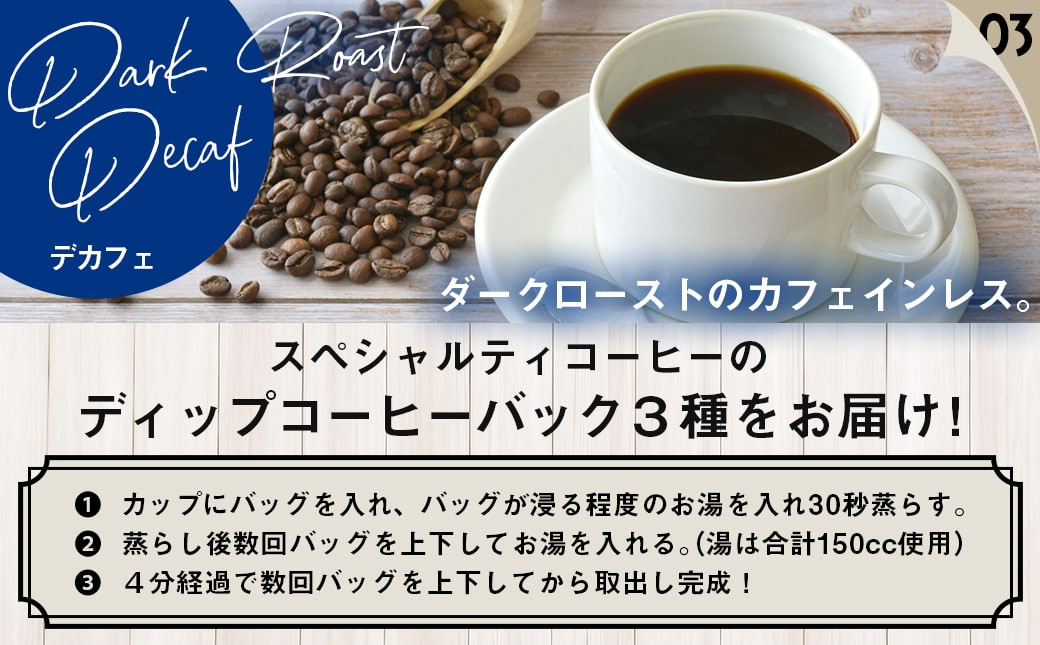 ダークロースト・ミディアムロースト・カフェインレスディカフェのディップコーヒーバッグをセットでお届けします。