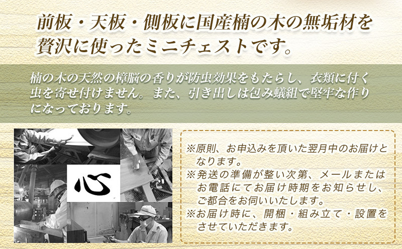 前板・天板・側板に国産楠の木の無垢材を贅沢に使ったミニチェストです。