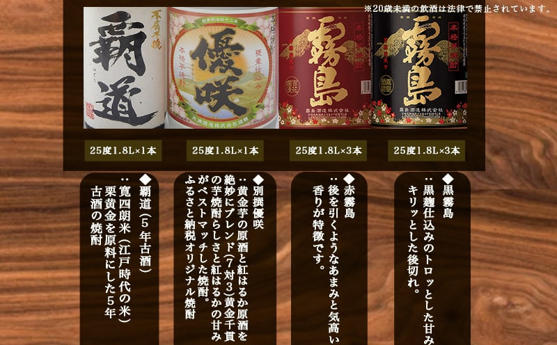 | 容量 | 焼酎 ・覇道 (25度) 1.8L×1本 ・別撰優咲 (25度) 1.8L×1本 ・黒霧島 (25度) 1.8L×3本 ・赤霧島 (25度) 1.8L×3本 合計8本 ※20歳未満の飲酒は法律で禁止されています。 |