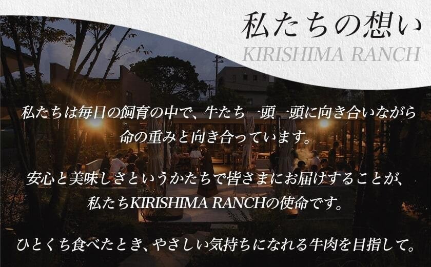 鹿児島県と宮崎県の県境に広がる霧島連山の豊かな自然のもと、黒毛和牛専門牧場の「KIRISHIMA RANCH」で大事に育てられた『霧島和牛』