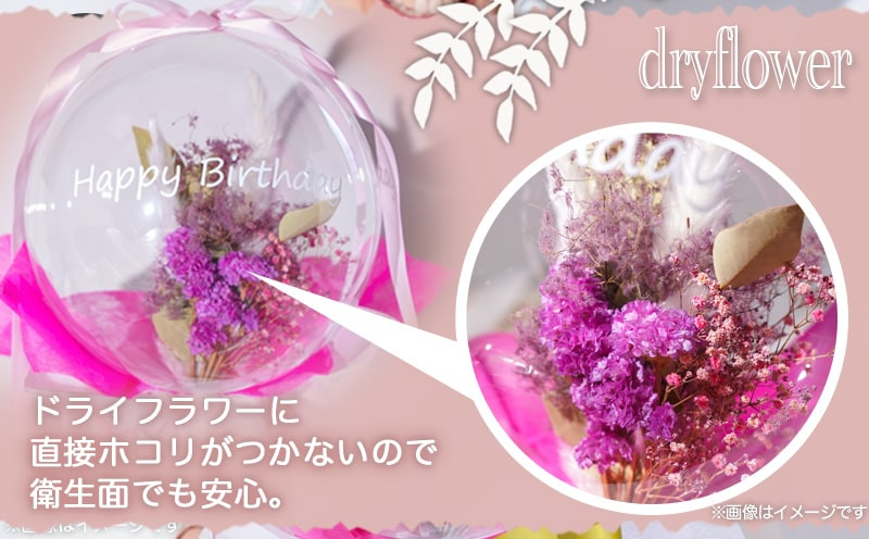 しっかりとしたビニール素材のバルーンの中に、可愛らしいドライフラワーを閉じ込めました。ドライフラワーに直接ホコリがつかないので、衛生面でも安心です。