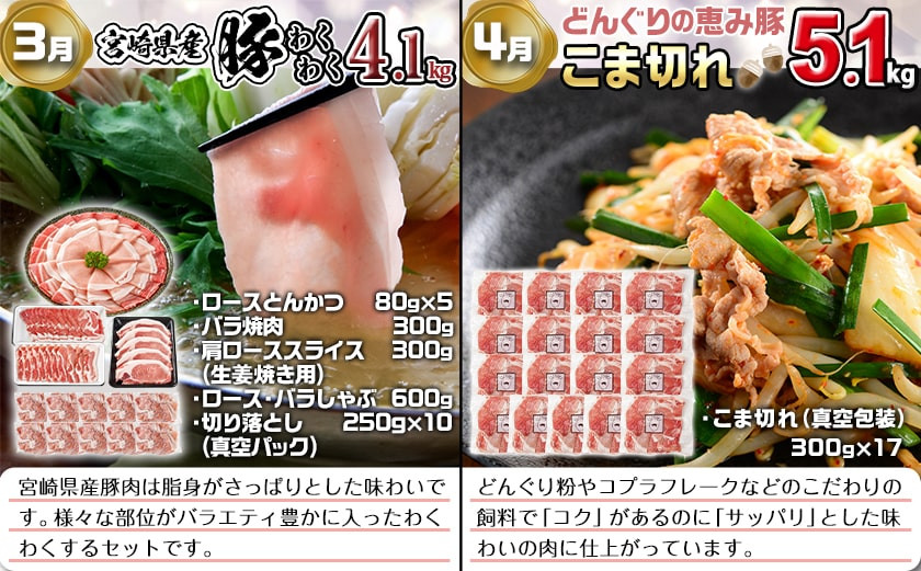 | 容量 | 1月:都城産豚切り落とし5.1kg(ジッパー付袋入り) 2月:国産豚肉切り落とし4kgセット 3月:宮崎県産豚わくわく4.1kgセット(真空) 4月:「どんぐりの恵み豚」こま切れ5.1kg 5月:国産豚肉詰め合わせ3.6kgセット 6月:宮崎県産豚肉4.2kgセット ※やむを得ない事情により返礼品が一部変更となる場合がございます。 ※配送月や各セット内容の変更はいたしかねますので、ご了承ください。 |