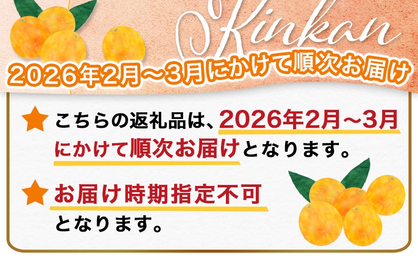 | 発送期日 | こちらの返礼品は、ご入金確認後、2026年2月~3月にかけて順次お届けいたします。 ※お届け時期の指定は一切お受け出来かねますのでご了承ください。 ※天候や収穫状況によって発送できない場合、別途ご連絡をさせていただく場合がございます。 ※ご不在日や住所変更の連絡がなく、返礼品が事業者へ返送されると再送はできません。 ※出荷後に配送先が変更になる場合の転送費用は、受取人様負担となります。 |