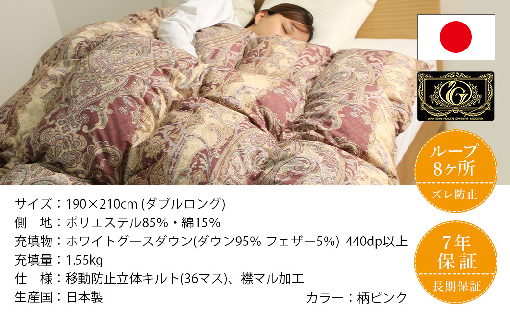 | 容量 | 日本製羽毛掛ふとん ■サイズ:190×210cm(ダブルロング) ■側地:ポリエステル85%・綿15% ■充填物:ホワイトグースダウン(ダウン95% フェザー5%) 440dp以上 ■充填量:1.55㎏ ■仕様 ・カバー固定ループ(8か所)付き ・ダウンプルーフ加工 ・移動防止立体キルト(36マス) ・襟マル加工 ・プレミアムゴールドラベル ・長期保証(7年) ■カラー:柄ピンク ■生産国:日本製 【ご使用時の注意】 ※小さな穴でも羽毛が飛び出します。カバー等を針や安全ピンで付けることは絶対にお止めください。 ※側生地の傷みや汚れを防ぐため、カバー等をご利用ください。 ※縫い目などから羽毛が出てくることがありますが、少量の場合は使用上問題ございません。 【ふとんのお手入れについて】 ※羽毛の臭いがしたら、お布団を畳んで中の臭気を押し出し、3~4時間天日に干してください。 ※お布団を干すときは、片面1時間・月1~2回程度、全体が日に当たるように両面干してください。 ※使用しないときは湿気の少ない場所へ、敷布団を下、掛布団が上になるよう収納してください。 ※家庭もしくはコインランドリーでの洗濯は出来ません。部分的に側生地が汚れたら、すぐにつまみ洗いし、十分乾燥してください。 ※やむ得ずクリーニングが必要な場合は、お近くのふとん店又はクリーニング業者にご相談ください。 【安心の長期保証付き(7年)!】 通常の使用で万が一不具合が生じましたら、返礼品到着より7年以内で修理もしくは交換を致します。 |