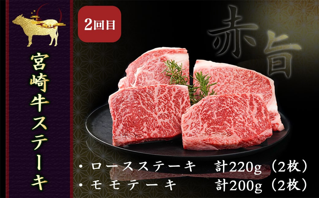 | 容量 | 宮崎県産宮崎牛 1回目 ・ロースステーキ 計220g(2枚) ・ヒレステーキ 計300g(2枚) 2回目 ・ロースステーキ 計220g(2枚) ・モモステーキ 計200g(2枚) 3回目 ・ロースステーキ 計220g(2枚) ・ミスジステーキ 計200g(2枚) ※お召し上がりの1日前より冷蔵庫に入れて解凍してください。 ※配送月や各セット内容の変更はいたしかねますので、ご了承ください。 |