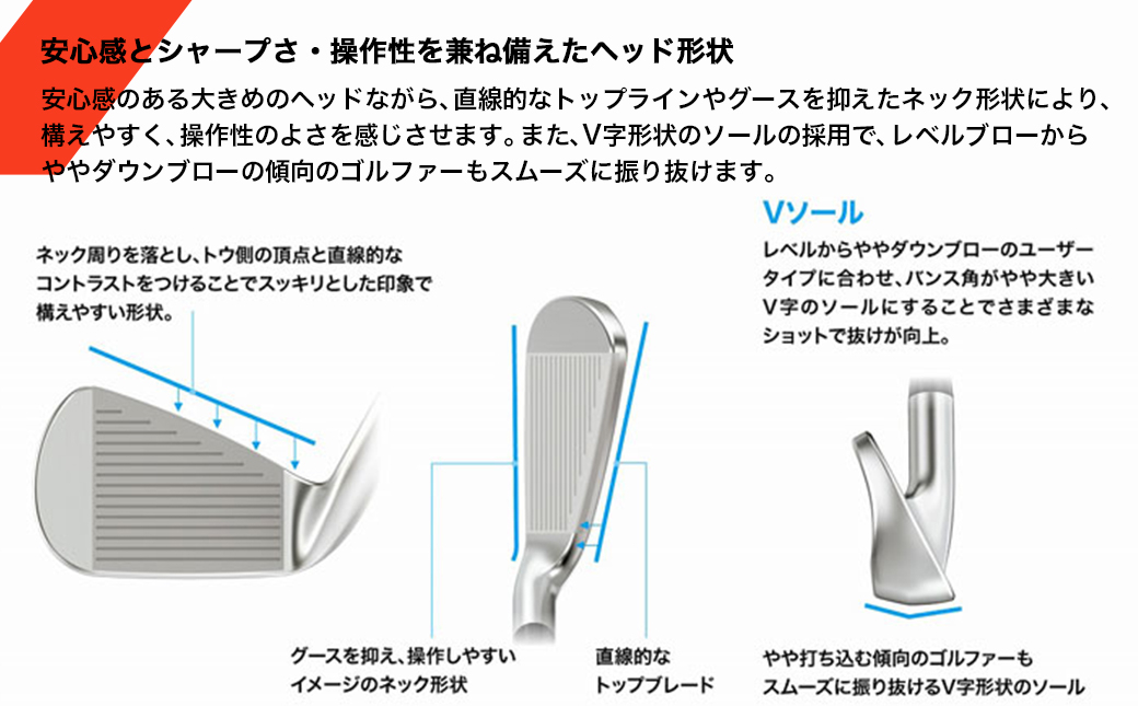 薄肉鍛造フェースに大型高比重タングステンニッケルウエイトをトウ側に装着した複合キャビティ構造により、低重心化を実現。