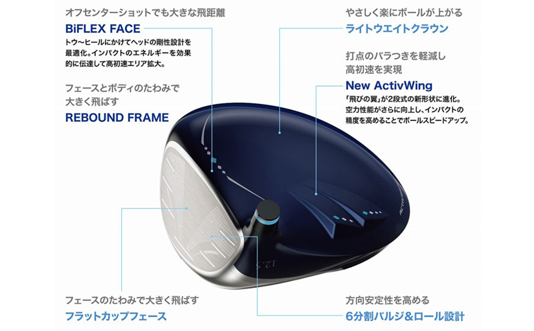 「飛びの翼」が2段式の新形状に進化。空力性能がさらに向上し、インパクトの精度を高めることでボールスピードアップ。