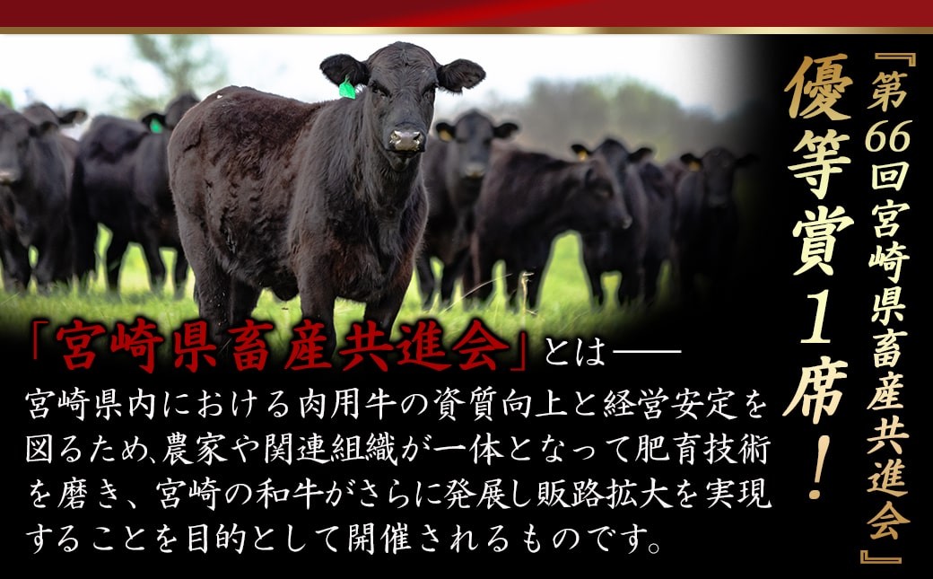 牛、豚の枝肉の肉質を競う、2025年10月21日に行なわれた、第66回宮崎県畜産共進会(肉牛枝肉の部)にて栄えある優等賞1席を受賞した宮崎牛の最高峰『グランドチャンピオン牛』です。