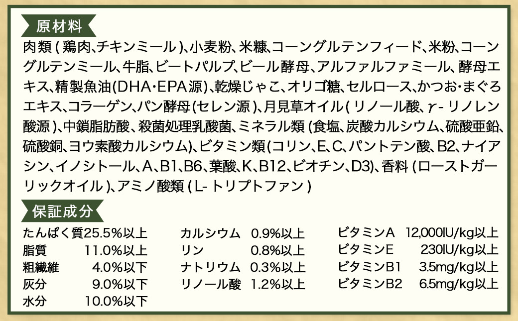 | 消費期限 | ※こちらは犬用フードです。 ・製造日より18ヶ月 開封後は袋をしっかりと密閉し、直射日光を避けて乾燥した風通しのいい場所に保存し、出来るだけお早めにお使いください。 |