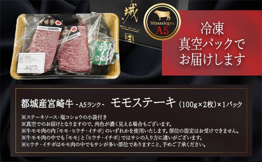 チョイスPayポイントと交換できる品 A5等級の宮崎牛モモ肉をステーキカットでお届け!単身世帯の方にもオススメ! 宮崎牛(A5等級)モモステーキ_MJ-0121_(都城市) 宮崎牛 A5等級 モモステーキ 都城産 A5 ステーキ 100g×2枚 真空パック ステーキソース 塩コショウ付