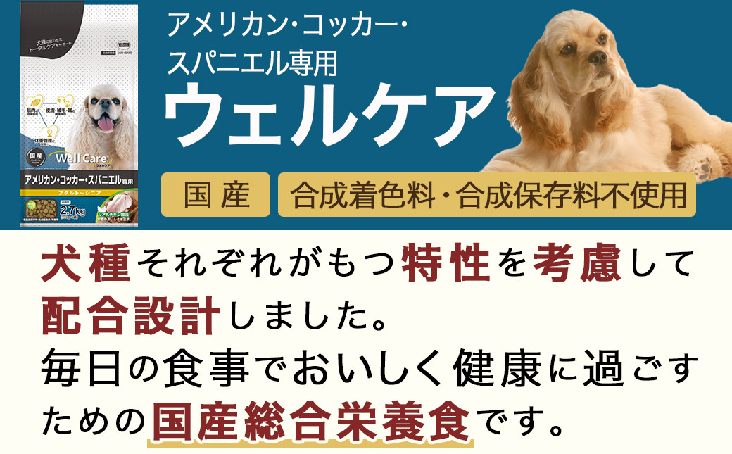 | 容量 | ドッグフード 国産総合栄養食 ≪ドライフード≫ ウェルケア アメリカン・コッカー・スパニエル専用 ・アダルト~シニア(中粒タイプ) 2.7kg(900g×3P) |