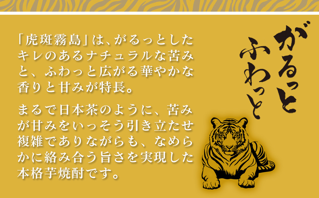 | 容量 | 焼酎 ・虎斑霧島(25度) 900ml×1本 ・赤霧島(25度) 900ml×2本 ※20歳未満の飲酒は法律で禁止されています。 |
