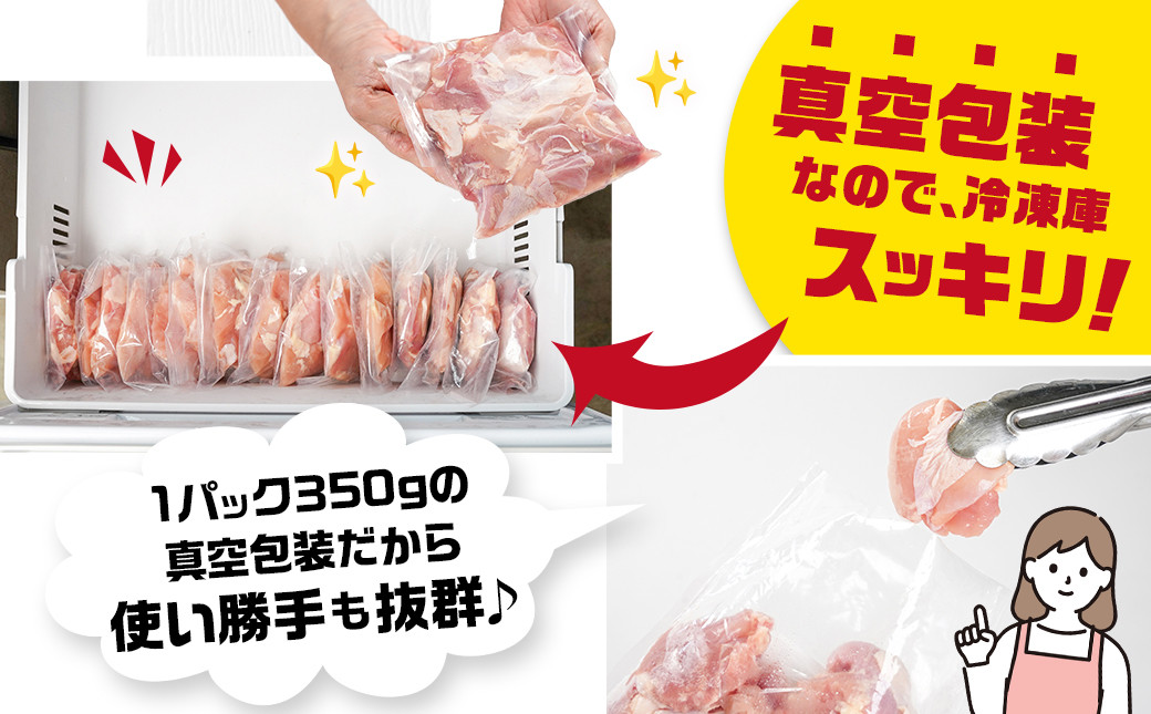 国産若鶏のモモ肉とムネ肉を一口サイズ(25g~35g)にカットし、1パック350gの真空包装にしました。