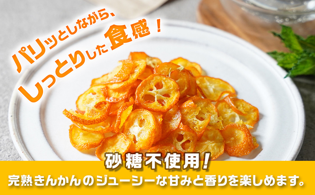 パリッとしながら、やや水分を残したしっとりした食感、完熟きんかんのジューシーな甘みと香りを楽しめます。