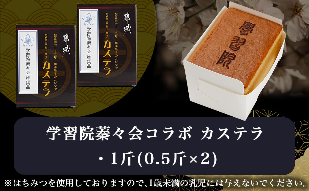 | 容量 | 学習院蓁々会コラボ  ・カステラ 0.5斤×2 ※はちみつを使用しておりますので、1歳未満の乳児に与えないでください。  |