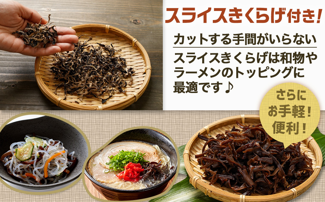 宮崎県都城産の乾燥黒きくらげ15gが1袋と、乾燥白きくらげ15gが1袋、そして食べやすいスライス形状の乾燥黒きくらげ15gが1袋のセットです。