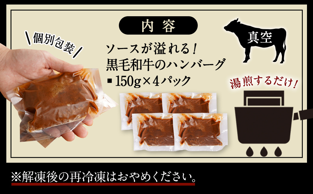 チョイスPayポイントと交換できる品 袋の中でハンバーグにソースが染みわたり絶妙なハーモニー♪ ソースが溢れる黒毛和牛のハンバーグ_AO-7704_(都城市) 黒毛和牛使用 ハンバーグ(ソース入り) 150g×4パック 真空パック 冷凍 黒毛和牛