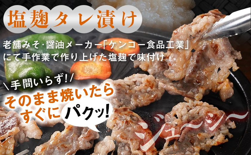 都城市にある創業50年を迎えるみそ・醤油メーカー「ケンコー食品工業」にて手作業で作り上げた塩麹で味付けしているので、「焼くだけ」の簡単調理で美味しく召し上がれます。塩麹で下味処理済なので、冷凍庫にストックしているととても重宝します。