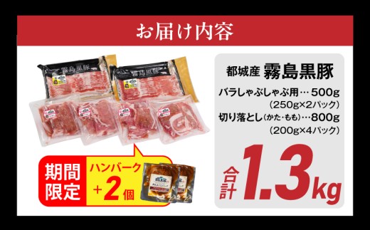 チョイスPayポイントと交換できる品 宮崎県のブランドポーク『霧島黒豚』は甘味のある旨さと白くておいしい脂肪が特長! 家計応援キャンペーン!霧島黒豚バラしゃぶ&切り落とし1.3kgセット+ハンバーグ_11-2807-CP_(都城市) 霧島黒豚 バラ しゃぶしゃぶ かた もも 切り落とし 小分け 煮込みハンバーグ デミグラスソース仕立て