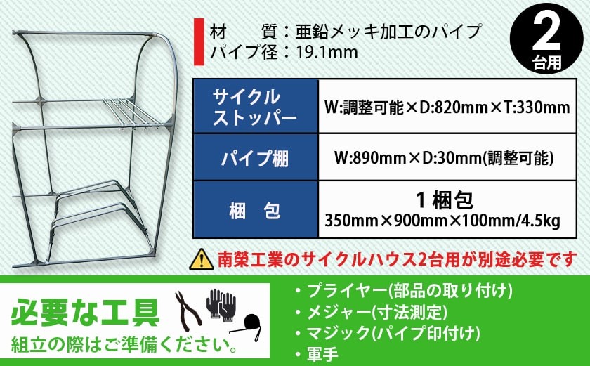 | 容量 | ・サイクルハウス カスタマイズキット≪2台用≫ ※南榮工業のサイクルハウス2台用が別途必要です。 ◆寸法 [サイクルストッパー]W:調整可能×D:820mm×T:330mm [パイプ棚]W:890mm×D:30mm(調整可能) ◆材質:亜鉛メッキ加工のパイプ ◆パイプ外径:19.1mm ◆梱包サイズ:1梱包(350mm×900mm×100mm/4.5kg) ※本返礼品は、組み立てが必要です。 ※組立説明書付き 《注意事項》 ※組立には工具等が必要です。セットには含まれませんので、ご自身でご準備ください。 ・プライヤー(部品の取り付け) ・メジャー(寸法測定) ・マジック(パイプ印付け) ・軍手 |