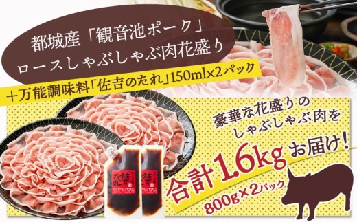 容量 | 都城産「観音池ポーク」 ・ロースしゃぶしゃぶ肉花盛り 800g×2P 万能調味料 ・「佐吉のたれ」 150ml×2パック |