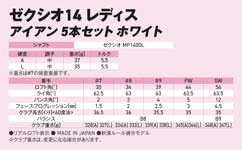 | 容量 | ゴルフクラブ ・ゼクシオ 14 レディス アイアン ホワイト 5本セット《2025年モデル》 1点 ■シャフト ゼクシオ MP1400L カーボンシャフト ■グリップ ゼクシオ 14 レディス専用 WEIGHT PLUS フルラバーグリップ (バックラインあり、ロゴ入り)〈38g/口径61〉 ■MADE IN JAPAN ※新溝ルール適合モデル ※Super-TIX 51AFとSuper-TIX 52AFSは日本製鉄(株)のチタン製品です。 ゴルフボール(都城オリジナルロゴ入) ・ゼクシオ HYPER RD(プレミアムピンク) 1ダース ■MADE IN JAPAN ※ボールNOはお選びいただけません。 ※保証書は2年間有効となります。保証書を紛失されますとクラブ修理はいかなる場合でも有償扱いとなるため大切に保管ください。 また保証書がある場合でも有償扱いになる場合があります事をご了承ください。詳しくはゴルフクラブ保証規定をご確認ください。 |