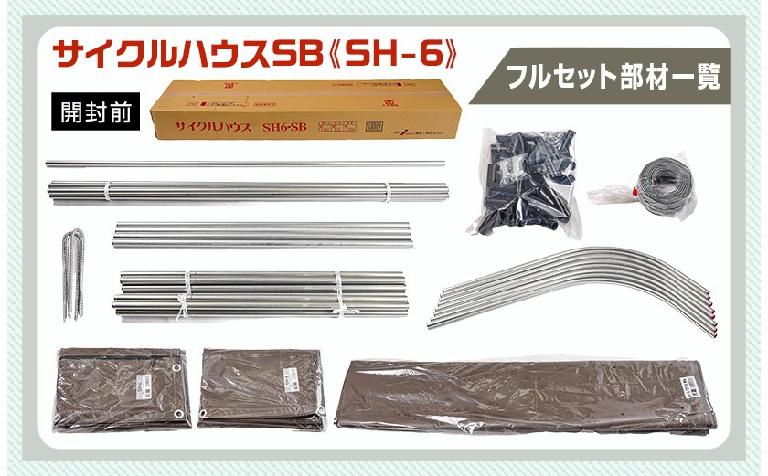 | 容量 | ・サイクルハウスSB(スーパーブラウン)1セット〈SH-6〉 〔自転車3台収納可能・カーテン式〕 ◆寸法 間口:1.56m 奥行:2.20m 高さ:1.89m 入口高さ:1.57m ◆幕:天幕/前幕/後幕 ◆幕色:SB(スーパーブラウン) ◆材質:ターポリンシート ◆パイプ径:19.1mm ◆梱包サイズ:1梱包 1450 x 330 x 180mm / 28.0kg ※部材内容は画像を参照ください。 ※本返礼品は、組み立てが必要です。 ※組立説明書付 《注意事項》 ・組立の際は以下の工具が必要になりますのでご準備ください。 ・軍手、プラスドライバー、プライヤー(部品の取り付けに)、はさみ、カッター、マジック、ゴムハンマー(樹脂ジョイントとパイプの差し込みに)、セットハンマー(U字杭の打込みに)、メジャー(寸法測定用) |
