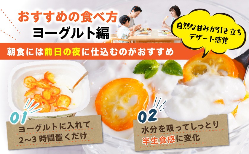 ・無糖ヨーグルトにお好みの量を入れて2〜3時間ほど冷蔵庫に置いておくと、ドライきんかんがヨーグルトの水分をほどよく吸い込み、しっとりとした半生食感へと変化します。きんかん本来の自然な甘みと香りが引き立ち、デザート感覚でお楽しみいただけます。