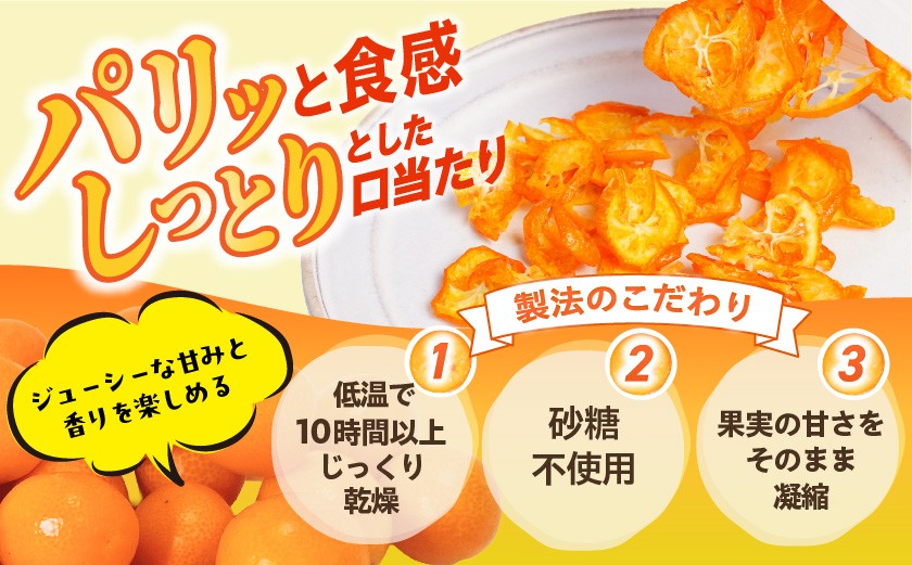 もちろん、そのまま召し上がっていただいても、パリッとした食感でありながらも程よく水分を残したしっとりとした口当たりで、完熟きんかんのジューシーな甘みと香りを楽しめます。