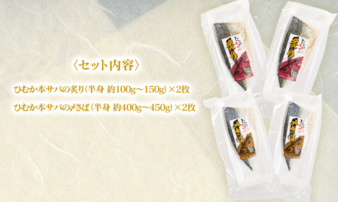 | 容量 | ひむか本サバの炙り(半身 約100g~150g)×2枚 ひむか本サバの〆さば(半身 約400g~450g)×2枚 |